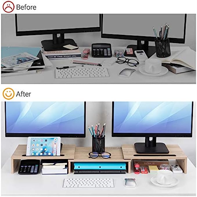 CUSTOMIZE YOUR STAND: Freely adjust the height and angle as you need. This dual monitor riser could help you to form a comfortable sitting position and gain a better viewing experience.