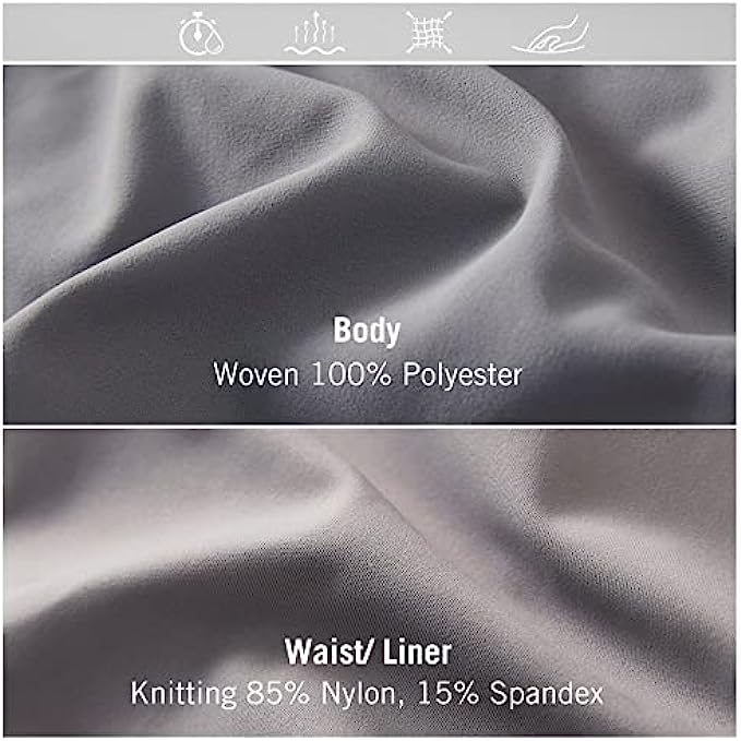 Liner: 85% Nylon, 15% Spandex Pull On closure Stretch compression liner shorts provide a supportive fit for enhanced coverage. 3" inseam won't roll up when exercise 4" outer layer with lightweight and quick-dry fabric wicks away sweat to keep you cool and comfortable in hot summer days, side split design for wide range of motion The built-in shorts with side pockets store your cell phone conveniently. Back pocket allows for keys or cards to free your hands when workout or running Mid high rise knitted waistband brings soft, stretchy and comfy feeling Women's 2 in 1 running shorts with phone pockets is perfect for your running routine, daily training, athletic, jogging, workout, gym fitness and walking