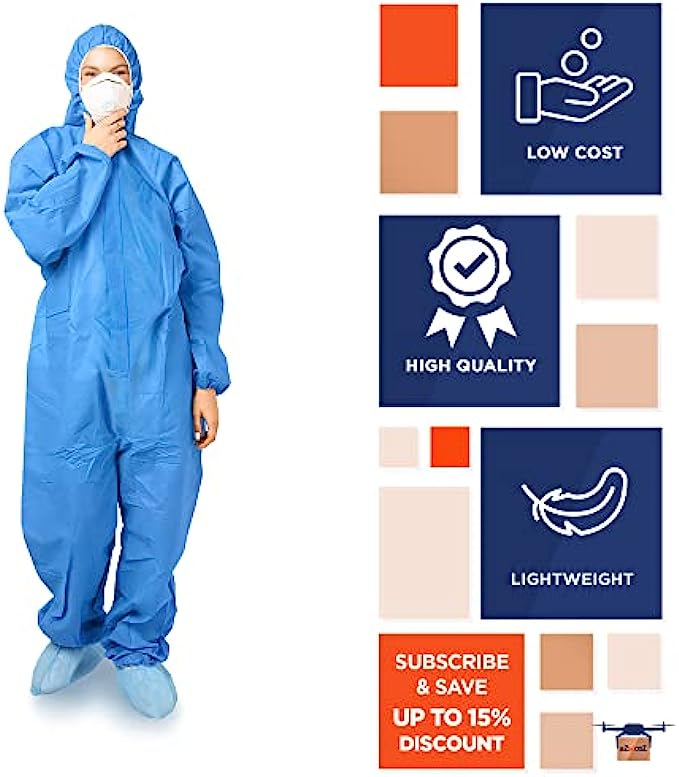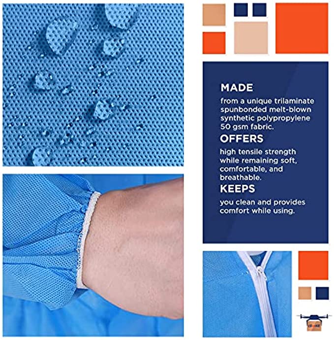 SMS Polypropylene (Spunbond-Meltblown-Spunbond) Coverall Made in the USA and Imported Hand Wash Only BLUE SMS COVERALL feature zip-front, hood, elastic cuffs, ankles and waist. No pockets, long sleeves Serged seams. Waterproof. Excellent breathability. M size. Meet the requirements in many applications will provide perfectly adequate protection. 1 pack. PREMIUM QUALITY: These blue disposable overall are made from a unique trilaminate spunbonded melt-blown synthetic polypropylene 50 gsm fabric that offers high tensile strength while remaining soft, comfortable, and breathable. The material is low-linting and resistant to tears and punctures. RELIABLE PROTECTION: These heavy-duty garments provide protection from many dry particulates without sacrificing comfort or restricting movement. SMS material coverall guard against sprays, powders, fiberglass and sanding dust. Durable and abrasion resistant. LOW-COST: Our lightweight overall provide effective and protection. Economically priced garments are light and offer better breathability and increased comfort saving your money. No pockets help to keep the cost low. MULTIPLE APPLICATION: These unisex disposable PPE garments can be used industrial, electronic, environments. This overall clothing can be also used for such activities as manufacturing, cleaning, plumbing, construction, painting.