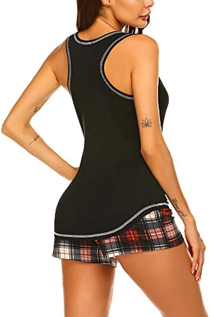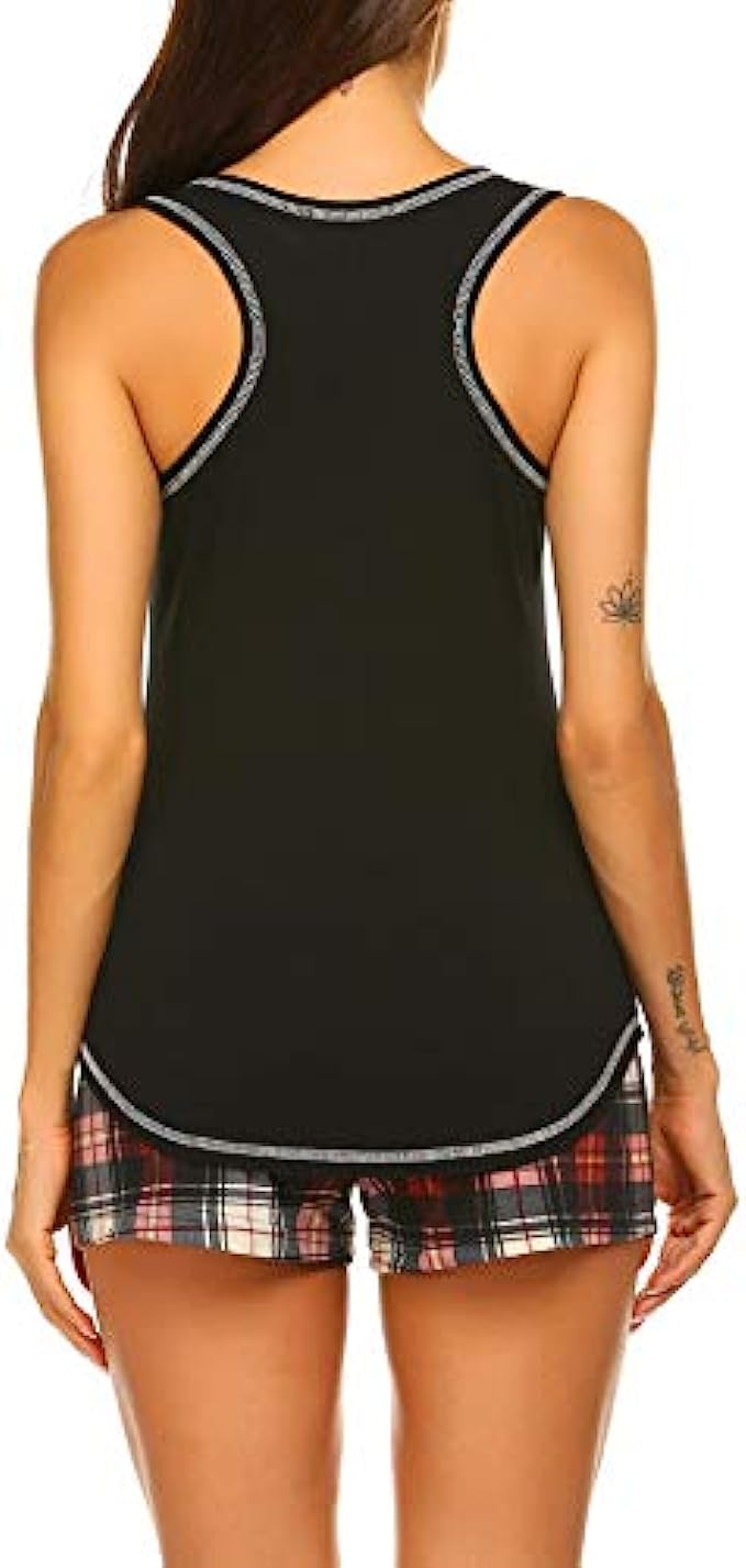 • Two piece womens pajamas set, Includes Racerback Solid Color Tank Top and Plaid Shorts