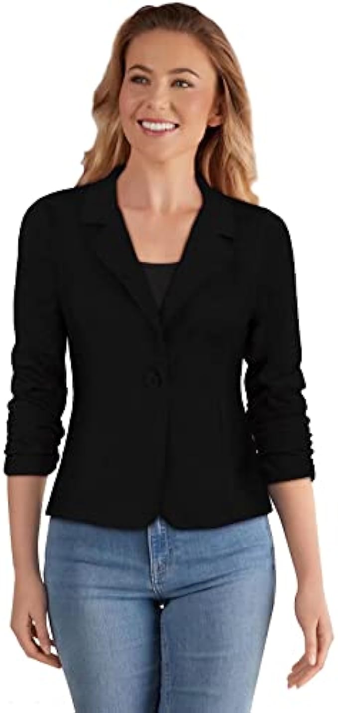 Blaze a new trail in this polished blazer at an unbeatable price.Its top quality construction will make it a reliable piece for years of incredible work outfits to come. Made in the USA CLASSIC DESIGN - We've designed this blazer with you in mind: professional, form-fitting and flattering. The single front button makes it easy to put on and take off. 3/4 scrunch sleeves add an extra touch of style while remaining comfortable closure VERSATILE - The Hybrid & Company Women's Blazer is a classic, versatile design. Wear it to the office, on date night, or even to a wedding! It's perfect for any occasion and can be paired with jeans or pants. PREMIUM QUALITY - We are proud to offer high quality, durable clothing at an affordable price. Our blazers will last for years and maintain their shape. VARIOUS SELECTION - You can choose from a variety of colors, styles, and sizes to find the perfect fit for you! Available in plus and junior sizes. MADE IN USA - Our blazers are manufactured right here in the United States of America by our team of skilled craftsmen who take pride in the workmanship and the quality garments they produce. FOR THE PROFESSIONAL WOMAN - This blazer is perfect for the professional woman who wants to look classy yet still be able to move around freely in her office.