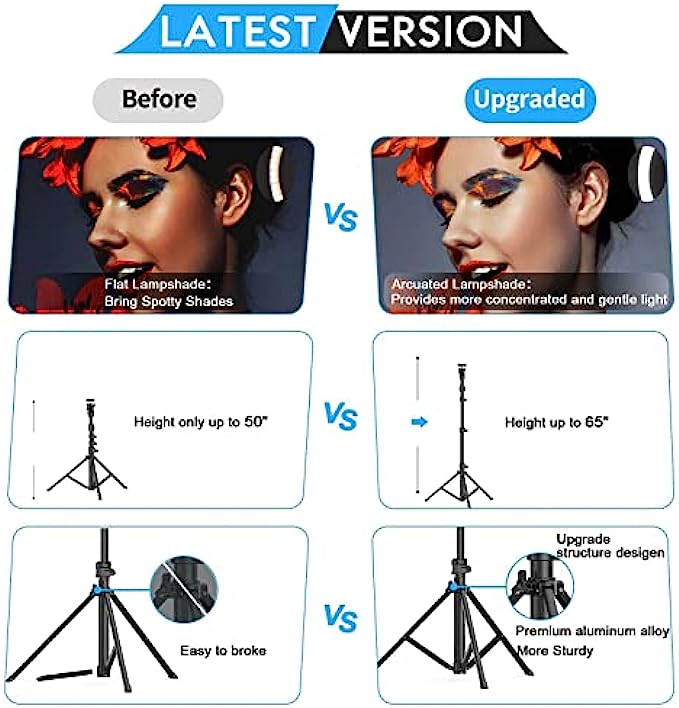 • 【Dimmable Circle Light & Upgraded Lampshade】Including 3-color lighting modes: Warm Light, Cool White, Day Light, each mode has 10 brightness levels, and a total of 30 options will meet all your needs in different circumstances. It is the perfect extra light to take away all the unflattering shadows. Compare to the flat lampshade, the light of the upgraded arched lampshade is more uniform and balanced, reduce the irritation of light, and protects our eyes. Influencers equipment must have.