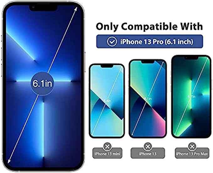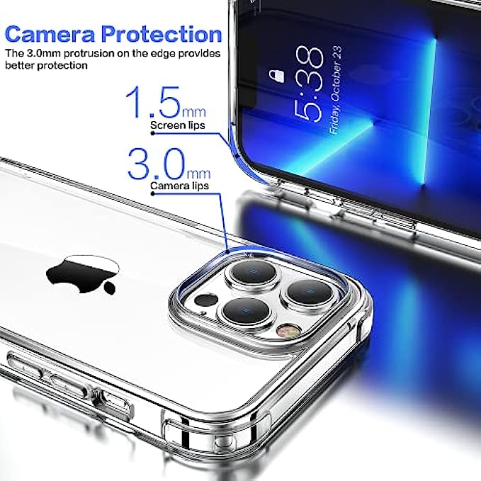 Only compatible with iPhone 13 Pro released in 2021. Protect your Camera lenses and screen : The lens protection lips raised 3.5mm on the back provides extra protection,effectively prevents the camera lenses and screen from breaking and scratching. Special design Cover for clear iPhone 13 Pro Phone case perfectly for easy access to all buttons, speakers and charger slot. The middle of the four corners is a unique hollow design, bumper thickness raise to 3.1mm,which can buffer the pressure and protect your phone from sudden dropping. Transparent and anti-yellow Cover : Clear case for iphone 13 pro Using high-definition tpu and pc material, which effectively resist stains and sweat, not easy to get greasy and yellow over time,perfectly shows the original color of your phone.