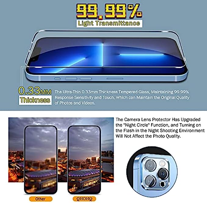 The tempered glass screen protector and camera lens protector are fully compatible only with iPhone 13 Pro Max 6.7". Note: This product was not designed for the iPhone 13 6.1"/iPhone 13 Pro 6.1" and other model. Easy installation, if you don't know how to install, please watch our installation video. High-Definition Function: The surface of the protective film is treated with a coating, which is very smooth, effectively reduce fingerprints from sweat and grease, making the screen very easy to clean. 99.99% optical-grade light transmittance, enhancing the visibility of the screen. Ultra-Thin and Curved Design: Made of 0.33mm tempered glass, maintaining 99.99% response sensitivity and touch, ensures quick app launch, smooth games and video playing, bringing you a perfect touch experience. 2.5D rounded corner design, the edge feels smooth and never scratches. AR Technology and Night Shooting Function: The camera lens protector are designed for iPhone 13 Pro Max 6.7", using augmented reality "Seamless" fusion new technology, with enhanced light transmission function, no need to design the flash hole position, even if the flash is turned on at night, it can be 99.99% guarantee the original quality of photos and videos. Specialty: Full screen coverage protection (except edges). The protective film surrounds the entire iPhone 13 Pro Max 6.7" display, but in order to enhance compatibility with most case, the tempered glass designed to cover the edge of the phone as much as possible, will not cover the entire phone screen.