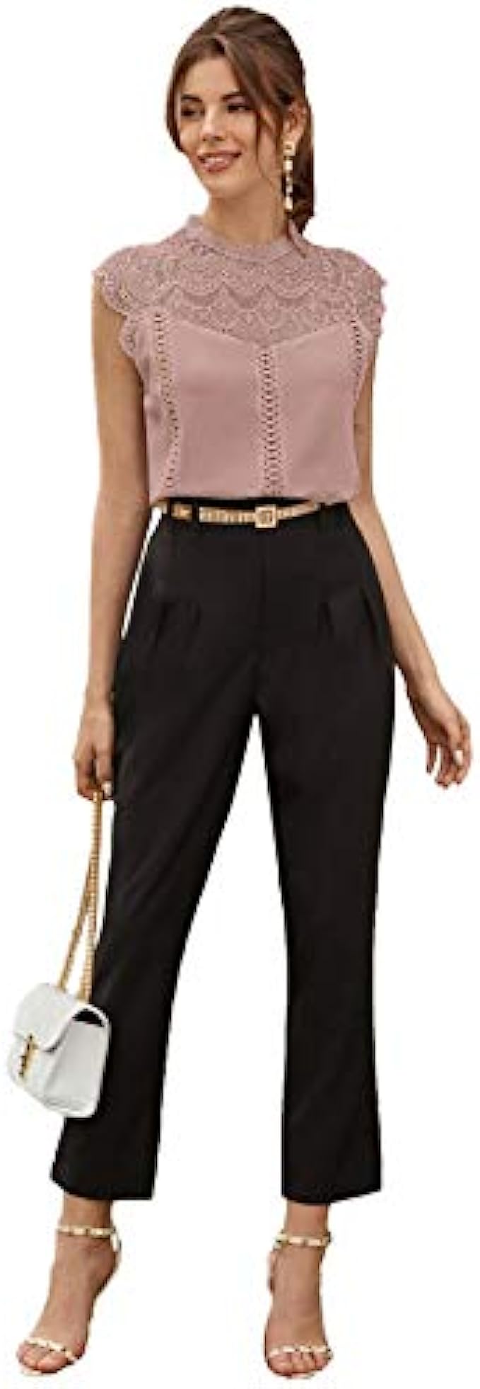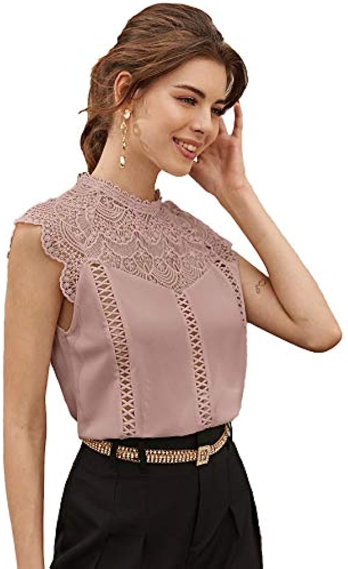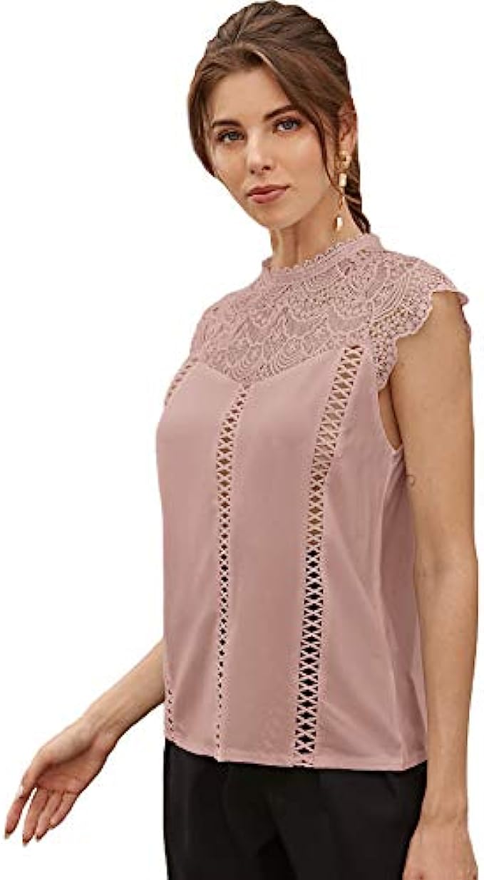 SheIn Women's Elegant Cap Sleeve Keyhole Contrast Lace Blouses Tops