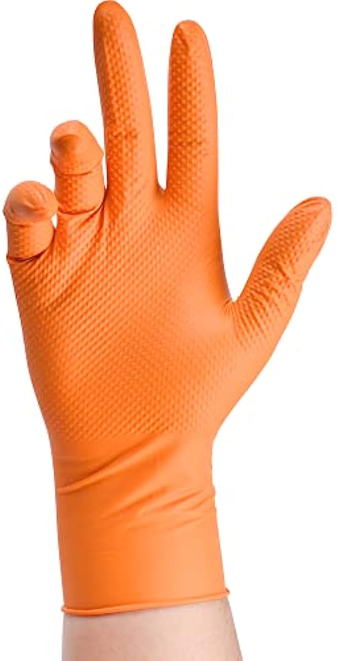 Imported Elastic closure HEAVY DUTY: TitanFlex 8-mil premium nitrile gloves are 2-3 times thicker than typical disposable nitrile gloves, and provide more puncture resistance and excellent barrier protection against grease, gasoline, and many other petroleum-based chemicals. THOR GRIP DIAMOND TEXTURE: Fully textured fingers and palms with arrayed raised diamond patterns provide 60% more gripping power than standard nitrile gloves, but yet have good dexterity for handling small objects and tools even wet or slippery. HIGHLY VISIBLE: The bold orange color makes the nitrile gloves and your hand easily recognizable and alerting even in darker environments, greatly improving safety in heavy-duty tasks such as mechanic, automotive, construction, and manufacturing. LATEX-FREE GLOVES: Free of natural rubber latex, these disposable nitrile gloves help reduce allergic skin reactions to latex and protein; they are elastic, stretchy, and have a snug fit, but provide more chemical resistance than latex gloves. MULTIPURPOSE: Our disposable industrial-grade nitrile gloves can be used for various industrial, commercial, and household applications such as mechanics, auto repair, janitorial, painting, plumbing, oil changes, manufacturing, & household cleaning.