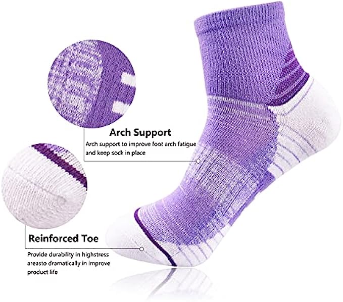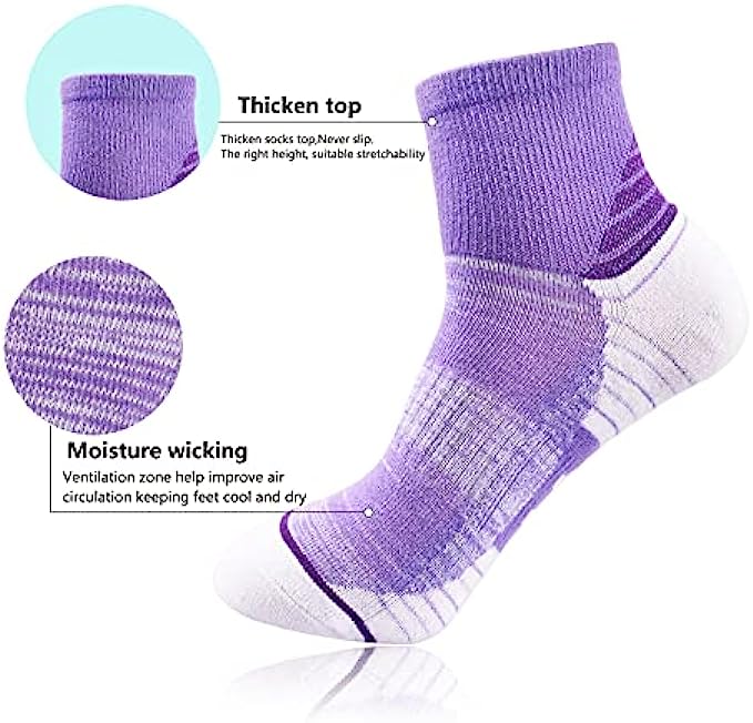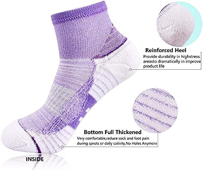 80% Cotton, 17% Polyester, 3% Spandex Tumble Dry,Air Dry,Hand Wash 【QUALITY MATERIAL】Material of Women's Athletic Ankle Socks:80% cotton, 17% polyester, 3% spandex,Stretchy, comfortable, lightweight, wearable and sweat-wicking. High quality material makes these.Women's low cut sports socks so soft and comfortable to keep your feet dry throughout the day. 【 SIZE】Fits Women shoe size 5-9 / Socks size 9-11, 6 Pack socks for women.Good matching for all of your favorite athletic shoes.Moisture wicking, Fit for running, hiking, workout, walking, golf, gym, casual, sneakers, sports activities, casual, daily and other athletic outdoor activities and wide variety of summer and winter sports. 【 FEATURES】Women's cushion cotton socks breathable design, promote air circulation, wear cool and breathable. provides great comfort and no more blister, reduce sock and foot pain during sports or daily workout activities, Avoid friction damage caused by exercise. 【 DURABILITY】Arch Support, Arch Elastic provides added support, helps reduce foot fatigue and prevents bunching, keeping the sock from slipping down. Truly ankle length, not too tight, unique stretch cuffs for a secure fit. 【ALL-PURPOSE STYLE】These Women's quarter socks mixed colors put a fun finishing touch on your outfits. No need to worry about deformation or fading. No matter outside or inside,also daily wear and holiday, they have great usage. Perfect present for family members, friends and anyone you.